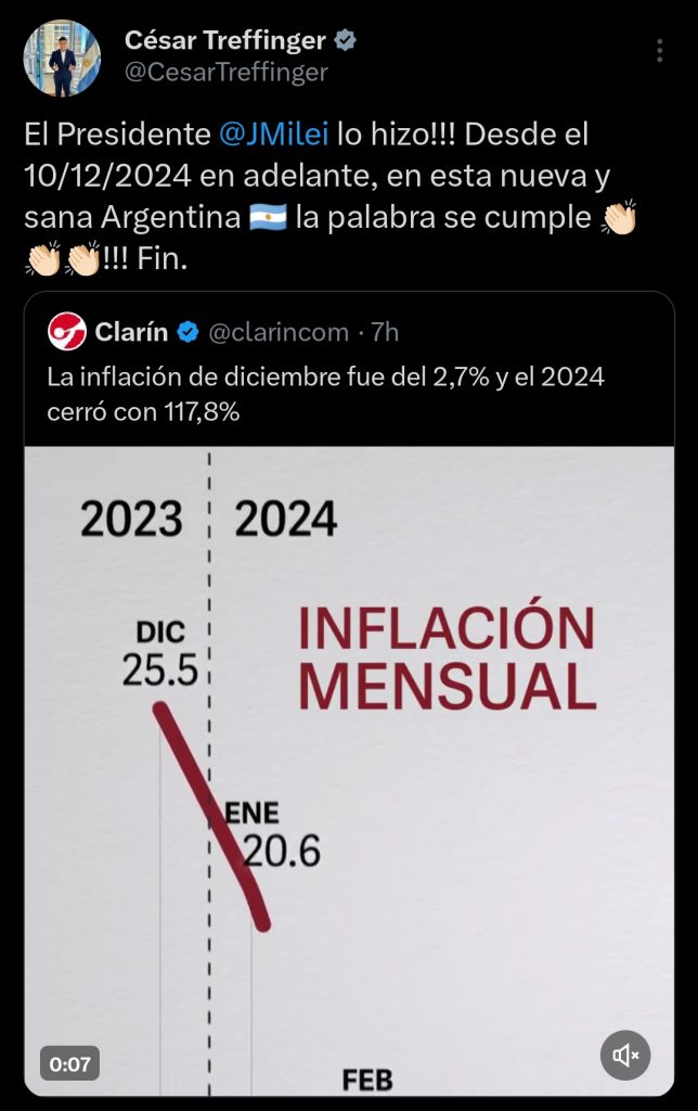 «El Presidente Javier Milei lo hizo!!! Desde el 10/12/2024 en adelante, en esta nueva y sana Argentina», celebró el diputado nacional, César Treffinger, en sus redes.
