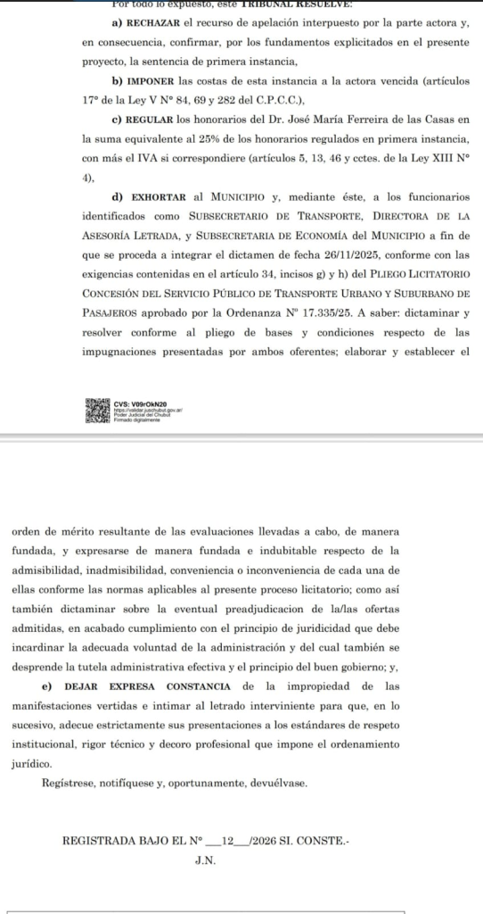 Esto se desprende de la resolución de rechazo al amparo donde el letrado de la transportista deja constancia que presentarían un recurso extraordinario a esa máxima instancia no solamente contra la municipalidad sino también contra la provincia «por los daños y perjuicios que pudieran generarse como consecuencia de errores administrativos o judiciales o de la demora en otorgar la documentación requerida».