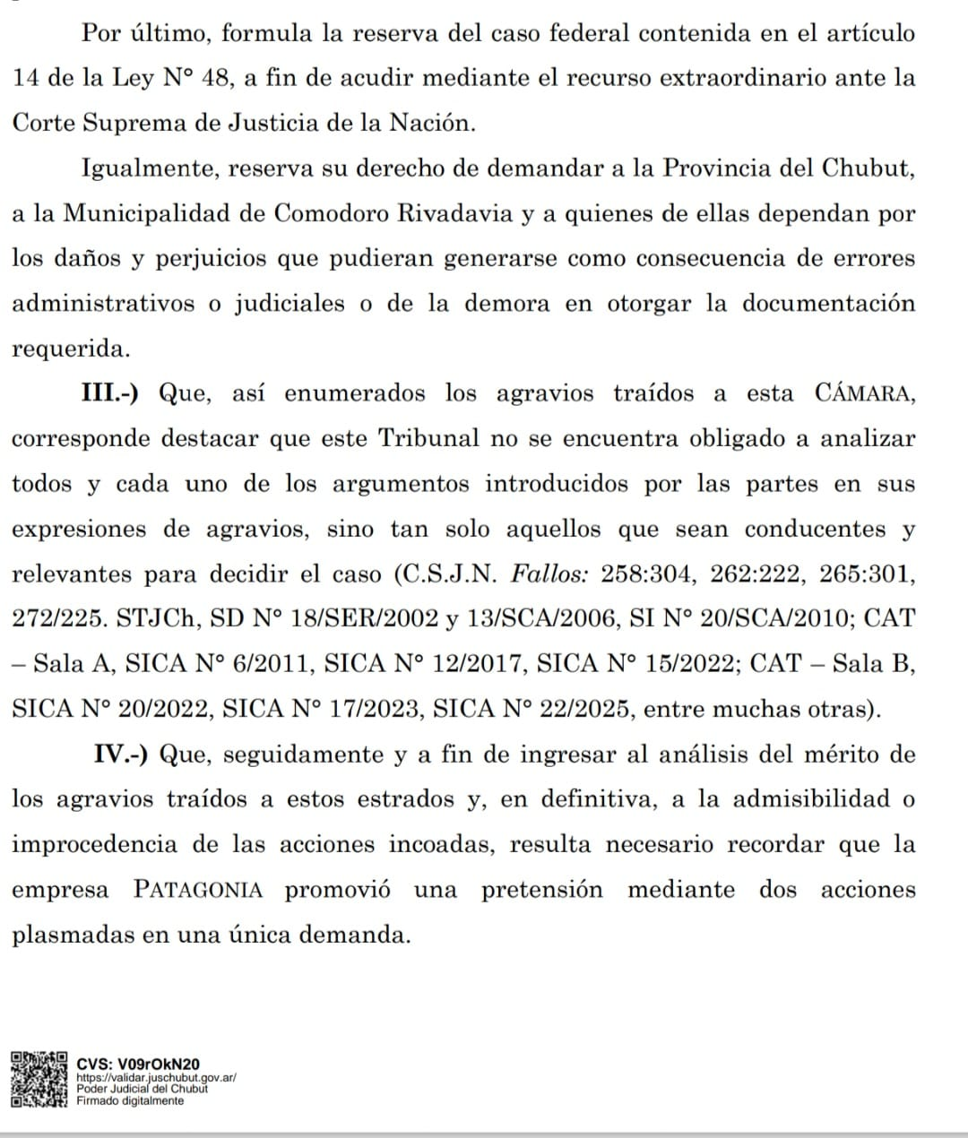 A pesar del rechazo en dos instancias judiciales del amparo presentado, Patagonia Argentina podría recurrir a una instancia más como es la Suprema Corte de Justicia.