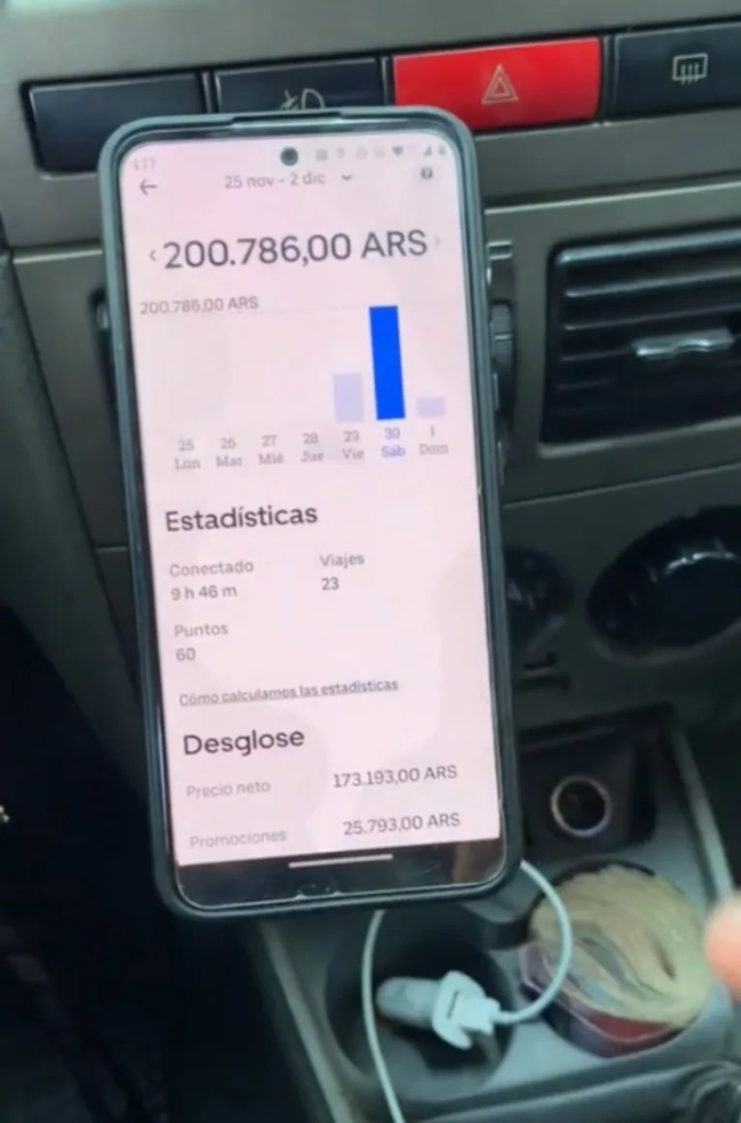 “El sábado marca $200.786 en un total de 10 horas haciendo 23 viajes”, continuó Tomás en su video. Por último, mostró cuánto ganó el domingo, donde trabajó una hora y media y tuvo solamente cuatro viajes: “No hice casi nada, $34.793″.