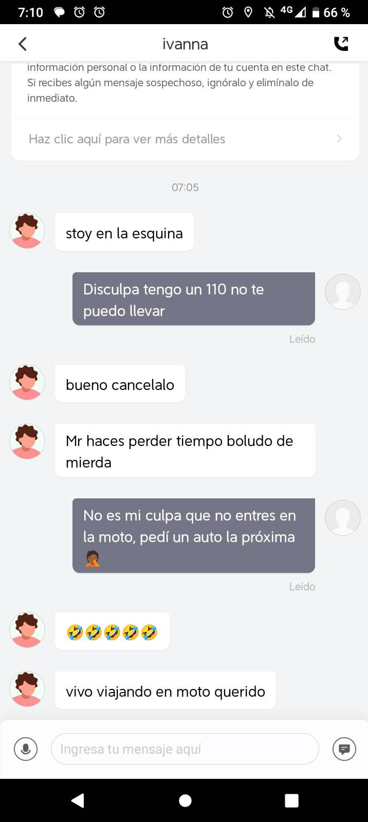 «Bueno cancelalo», acota la pasajera indignada, enfatizando en que le hizo perder el tiempo. La justificación del conductor no tardó en llegar y no tuvo mucho tacto para expresarla: «No es mi culpa que no entres en la moto, pedí un auto la próxima».