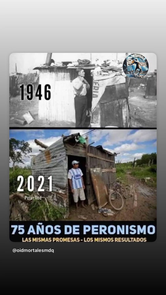 Cardozo mostró una foto de una vivienda precaria 1946 y la comparó con otra de 2021 en condiciones similares. Junto a ellas escribió la frase: “75 años de peronismo, las mismas promesas, los mismos resultados”.
