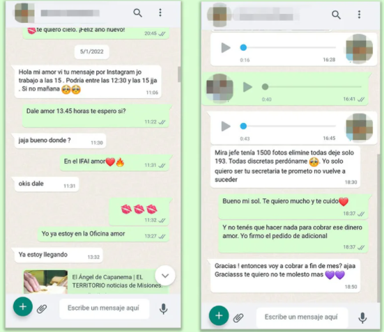 El escándalo que sacude a Misiones comenzó a gestarse en Semana Santa. Fue gracias a un perfil falso de Facebook -registrado con el nombre de “Turco Rodríguez” y una foto del funcionario- que publicó un archivo con 72 capturas de conversaciones y audios, en las que Rodríguez hablaba con varias mujeres y pactaba encuentros dentro y fuera de la oficina. A la mayoría de ellas se dirige con confianza, frases subidas de tono y de acuerdo con lo que se observa, la respuesta de todas las involucradas parece recíproca. Aparentemente, habría entablado un vínculo amoroso con todas ellas, pero al parecer no del todo gratuito.