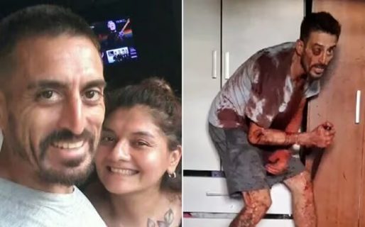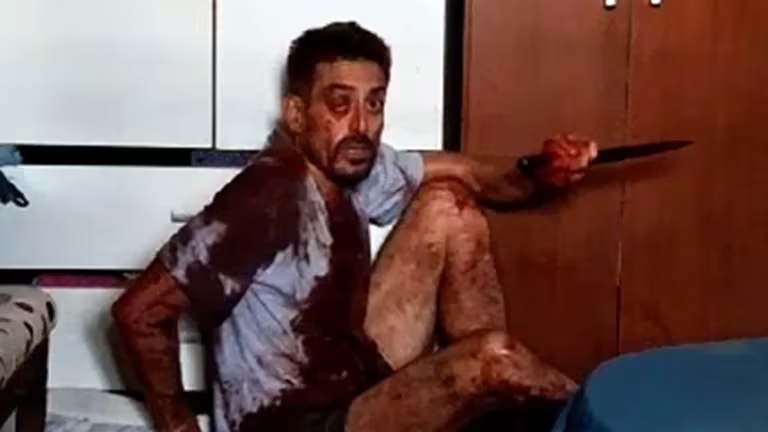 En las imágenes a las que accedió Infobae, se observa que el femicida, identificado como Matías Alejandro Guiñazú (43), estaba sentado y tenía un cuchillo en sus manos. A su lado yacía la víctima, Soledad Ibáñez (42), tirada boca abajo, sin moverse. El hombre tenía el cuchillo contra su cuello y amenazaba con quitarse la vida. Los policías trataron de disuadirlo. “No te quieras levantar, quedate quieto”, le pedía uno de los efectivos desde afuera, mientras otros trataban de ingresar a la propiedad.