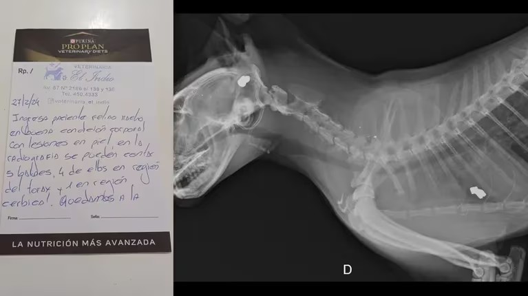 Los rescatistas lo llevaron de inmediato a la veterinaria, donde le hicieron radiografías. De esta forma, pudieron corroborar la cantidad de disparos que recibió. Con estos datos y un certificado del profesional, el vecino denunció el hecho en la comisaría y aportó datos del agresor, identificado con las siglas R J C.Los rescatistas lo llevaron de inmediato a la veterinaria, donde le hicieron radiografías. De esta forma, pudieron corroborar la cantidad de disparos que recibió. Con estos datos y un certificado del profesional, el vecino denunció el hecho en la comisaría y aportó datos del agresor, identificado con las siglas R J C.