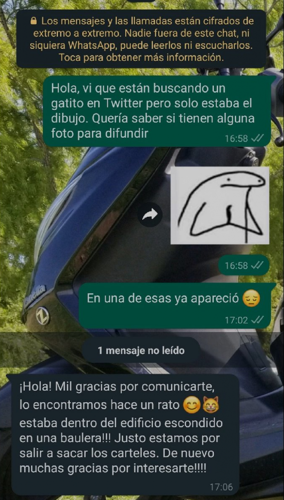 Uno de los usuarios que vio el tuit de la búsqueda con las fotos de los carteles le habló al número que figuraba en los dibujos, y recibió una respuesta que alegró a todos.