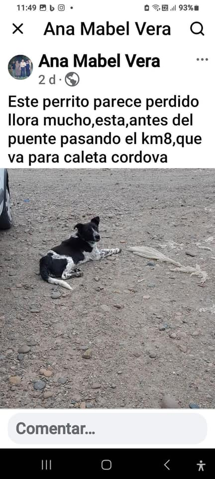 Vecinos informaron que el perrito ya había sido reportado en redes sociales hace aproximadamente dos días. La publicación original describía: «Este perrito parece perdido, llora mucho. Está antes del puente, pasando Caleta Córdova»