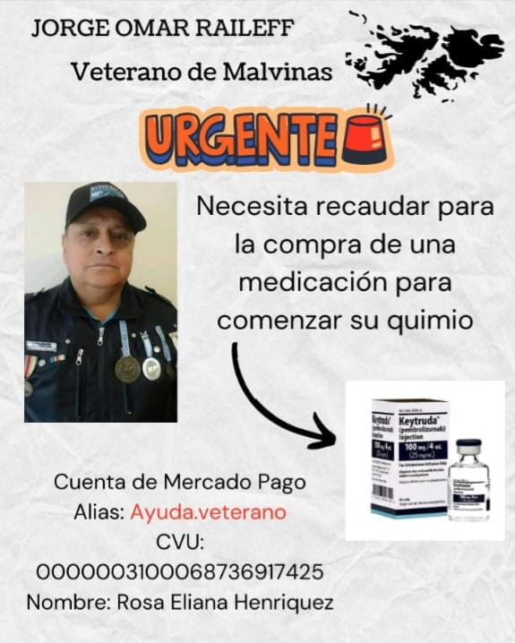 “Es un problema bastante serio porque no le cubre la medicación que está necesitando para poder llevar a cabo su tratamiento”, denuncian Juan Pérez y Víctor Contreras, referentes de veteranos de guerra que acompañan su caso.