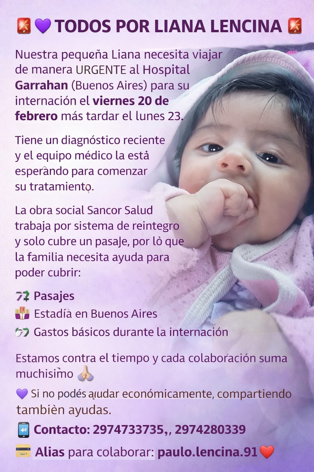 A la delicada situación médica se suma el contexto familiar. Los padres de Liana tienen otra hija de dos años que aún es amamantada y no tienen con quién dejarla en Comodoro Rivadavia, por lo que el traslado requiere que viajen los cuatro integrantes de la familia.