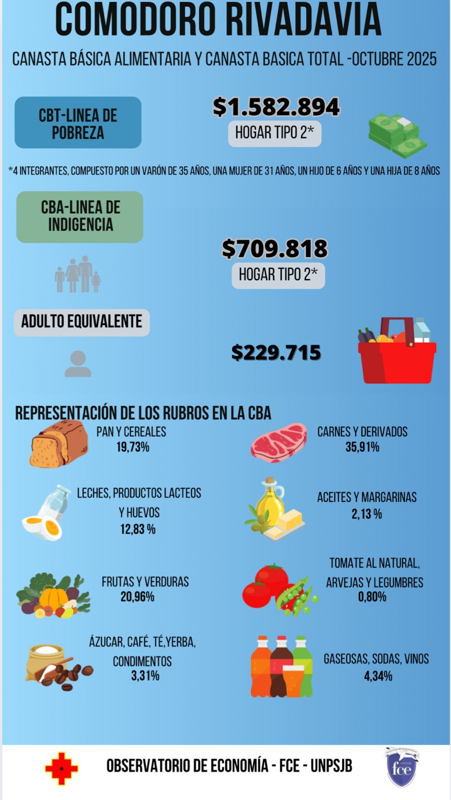 Según el informe, la Canasta Básica Total (CBT), que establece la Línea de Pobreza, alcanzó los $1.582.894 para un “Hogar Tipo 2”. Este hogar de referencia está compuesto por cuatro integrantes: un varón de 35 años, una mujer de 31 años, un hijo de 6 años y una hija de 8 años. Las familias que no alcancen este nivel de ingresos son consideradas en situación de pobreza.