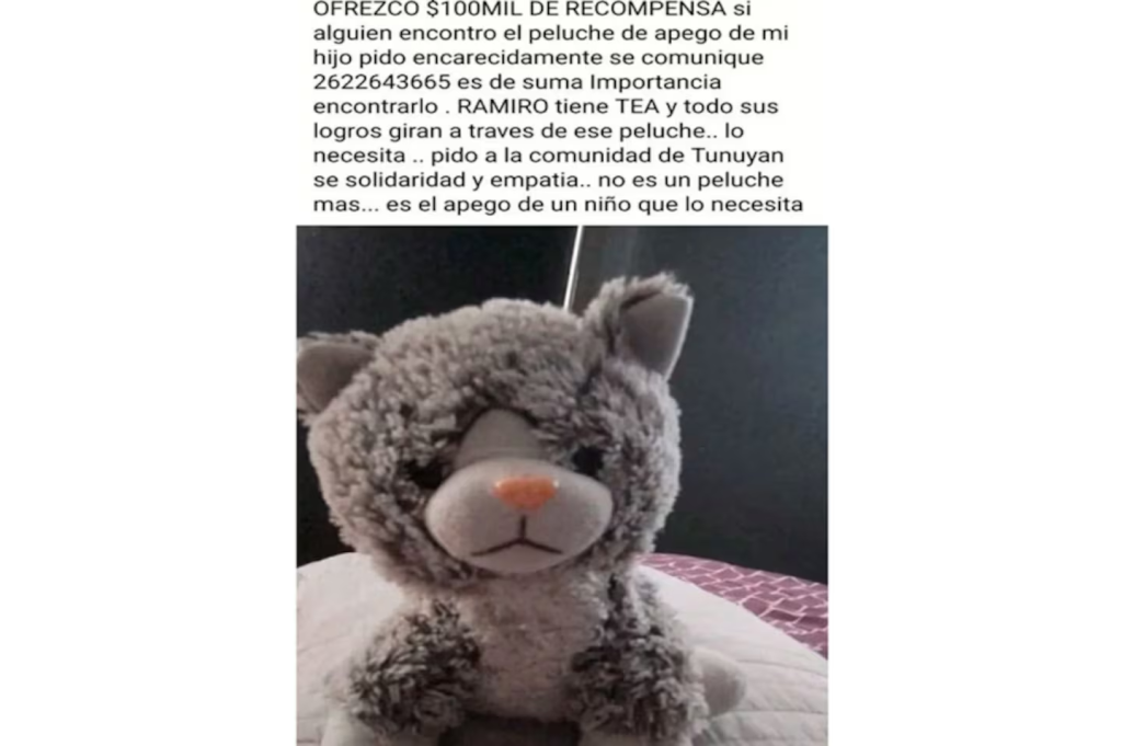 “Pido encarecidamente que se comuniquen al (número de teléfono de la familia), es de suma importancia encontrarlo. R… tiene TEA y todos sus logros giran a través de ese peluche… lo necesita. Pido a la comunidad de Tunuyán solidaridad y empatía… no es un peluche más. Es el apego de un niño que lo necesita”, escribió desesperada Ayelén, la mamá.