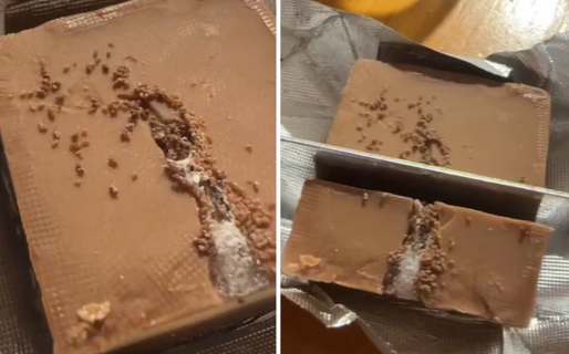 En la grabación se podía ver que el chocolate tenía una pequeña grieta y en su interior había moho. “Tengo miedo de partirlo y encontrarme un gusano…”, agregó Natalia. Sin embargo, tomó un cuchillo y lo abrió.