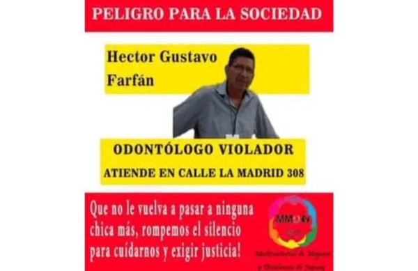 Esa entidad hizo circular un flyer por las redes sociales en donde acusa de «violador al odontólogoHéctor Gustavo Farfán» y con el fin de que «no le vuelva a pasar a ninguna chica más».