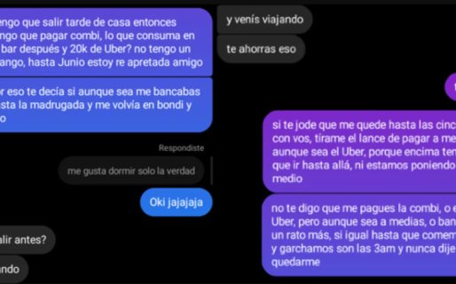 El hombre inesperadamente le contestó si no podía irse en tren y la joven retrucó que también comenzaba a funcionar a las cinco y que no podía tomarlo antes. Sin embargo, el chico siguió insistiendo en que busque otra alternativa para viajar y puso una excusa: “Me gusta dormir solo la verdad. Sino venite y te vas en Uber, no te va a salir tan caro a esa hora”.