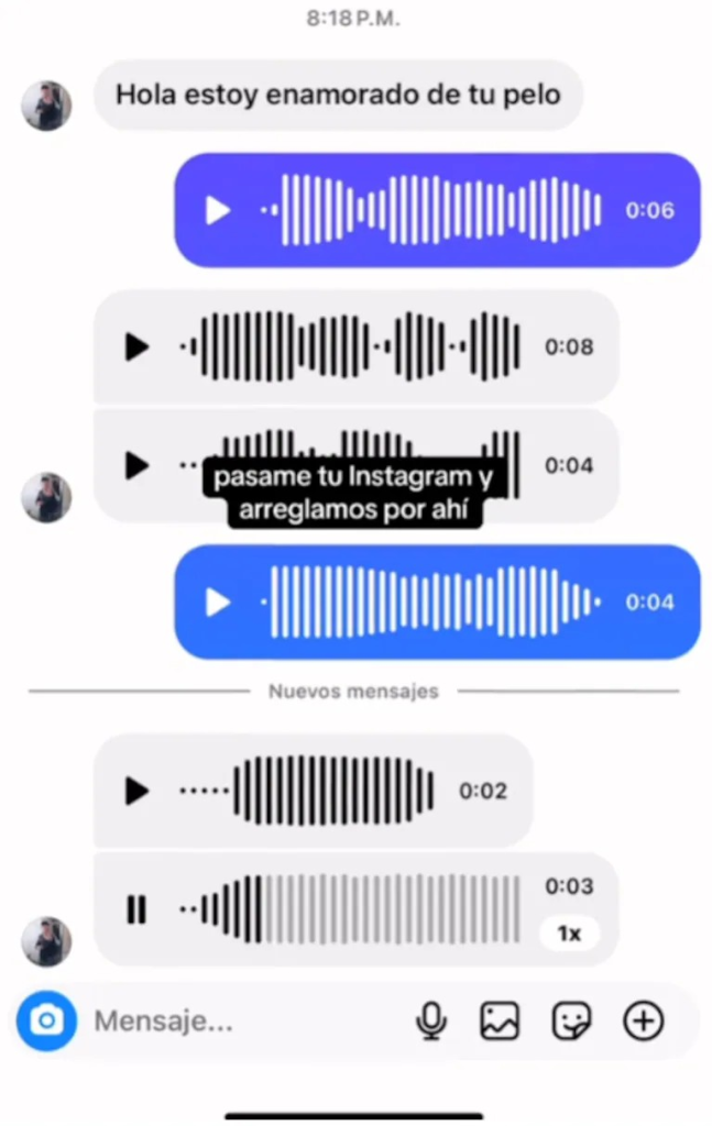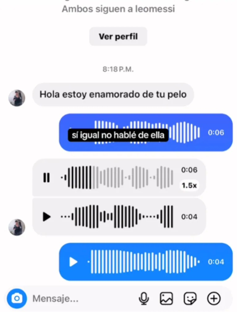 En primer lugar se puede ver que el primer mensaje del joven decía que estaba “enamorado” del pelo de ella. Pocos minutos después, el novio de la chica le contestó en su lugar con un audio que decía: “Si, la verdad bastante lindo el pelo ¿no? A mi también me gusta mucho”.