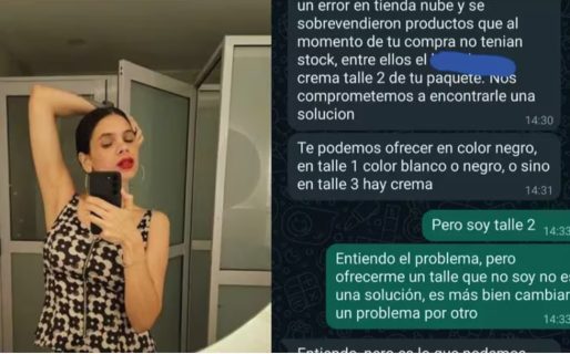 La dueña del local de ropa le escribió: “Hubo un error y se sobrevendieron productos que, al momento de tu compra, no tenían stock. Nos comprometemos a encontrarle una solución. Te podemos ofrecer en color negro. En talle 1, en blanco o negro. O sino, en talle 3 hay color crema”.