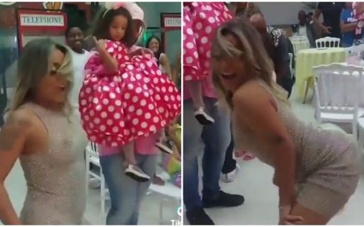 La usuaria @simonethomas632 compartió en la red social las imágenes del sorpresivo momento que vivieron los familiares y amigos de la nena de 3 años en un salón de fiestas de Brasil. En medio de la decoración de Minnie Mouse, la joven irrumpió y empezó a “perrear” al ritmo de la música. A pesar de que muchos se reían, a ella no le importó y hasta bailó arriba de una mesa con un vestido con transparencias.