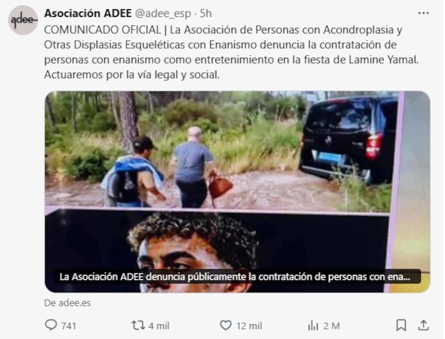 “La Asociación de Personas con Acondroplasia y Otras Displasias Esqueléticas con Enanismo denuncia la contratación de personas con enanismo como entretenimiento en la fiesta de Lamine Yamal. Actuaremos por la vía legal y social», dice el posteo que fue publicado en X.