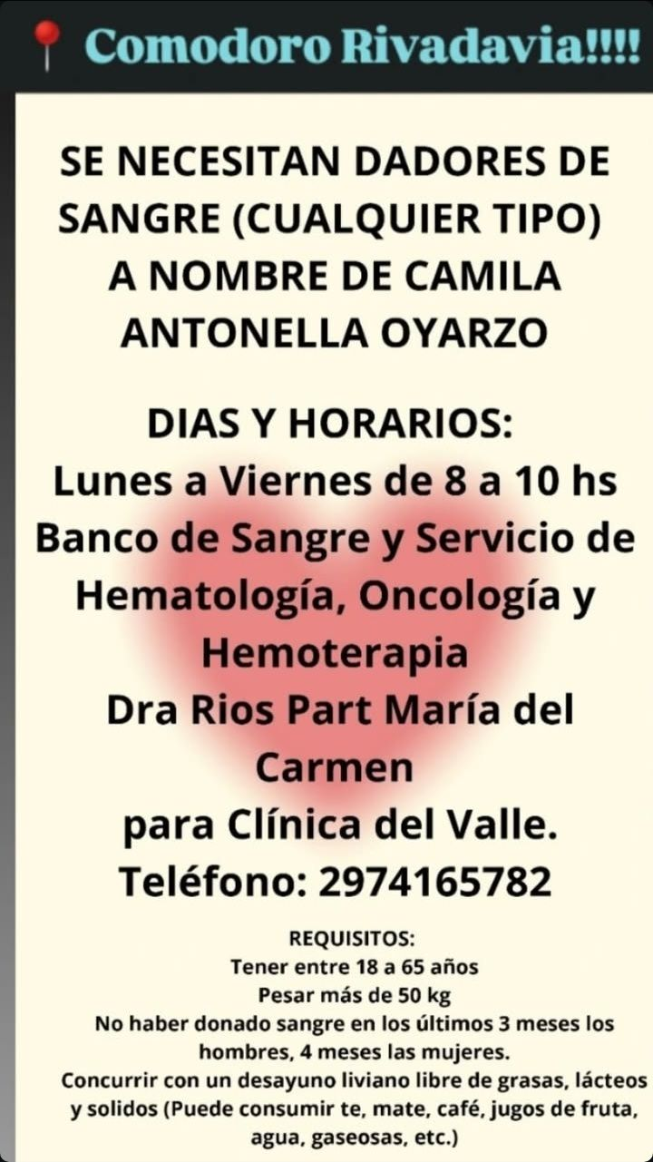 Camila Antonella Oyarzo, oriunda de Río Gallegos, se encuentra internada en la Clínica del Valle, en Comodoro. La familia realiza un llamado urgente a la comunidad para donar sangre y contribuir con su tratamiento.