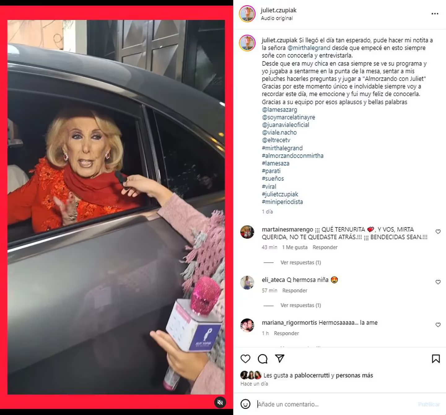 Con siete años, Juliet Czupiak ya entrevistó a figuras como Marcelo Tinelli, Pampita Ardohainy La Joaqui. Pero ahora la mini periodista fue por más y logró cumplir su sueño de conversar con Mirtha Legrand.