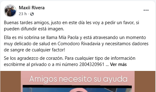 “Buenas tardes amigos, justo en este día les voy a pedir un favor, si pueden difundir esta imagen”, escribió el joven en su publicación, junto con un mensaje conmovedor: “Ella es mi sobrina, se llama Mía Paola y está atravesando un momento muy delicado de salud en Comodoro Rivadavia y necesitamos donantes de sangre de cualquier factor. Se los agradezco de corazón».