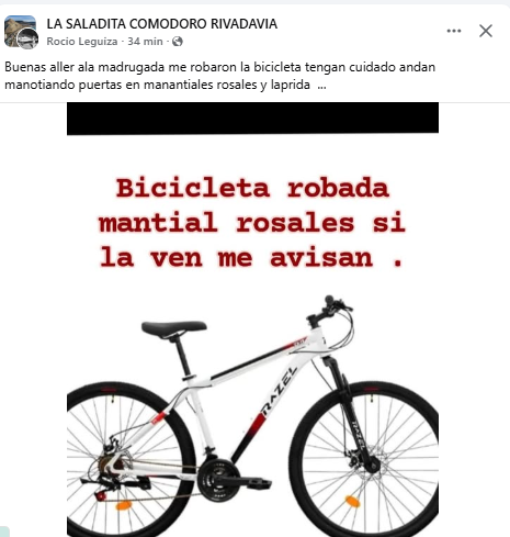 “Buenas, a la madrugada me robaron la bicicleta, tengan cuidado, andan manoteando puertas en Manantial Rosales y Laprida”, relató la mujer afectada. Además, agregó: “Si la ven, me avisan”.