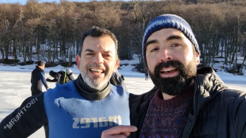 El lago Las Margaritas de Aldea Beleiro, localidad chubutense de 120 habitantes, fue el lugar elegido para ingresar al agua debajo de una capa de al menos 20 centímetros de hielo. El esquelense Marcos Ponce y el reconocido youtuber Tomás Barrios organizaron la experiencia digna de un documental.
