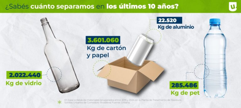 Tras una década de la campaña de separación de residuos y la gestión del Parque Ambiental de Comodoro Rivadavia el resultado arroja una recolección de 6.426.762 kg de materiales reciclables (desde el año 2015 al 2024) talescomo cartón, papel, aluminio, nylon y vidrio.