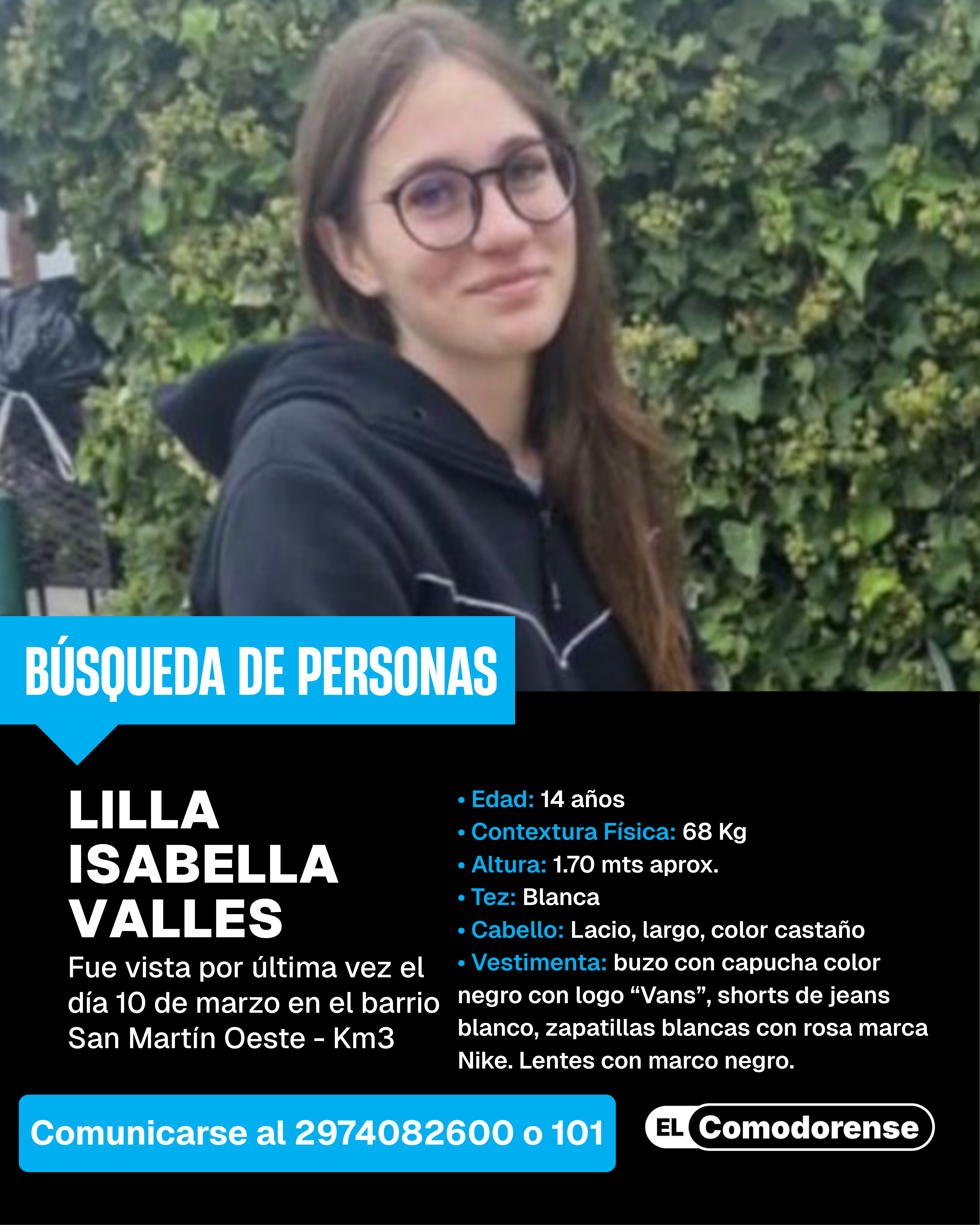 Además, al momento de su desaparición vestía shorts de jeans color blanco, buzo negro con capucha y la inscripción «Vans», zapatillas blancas con rosa marca Nike y lentes con marco negro.
