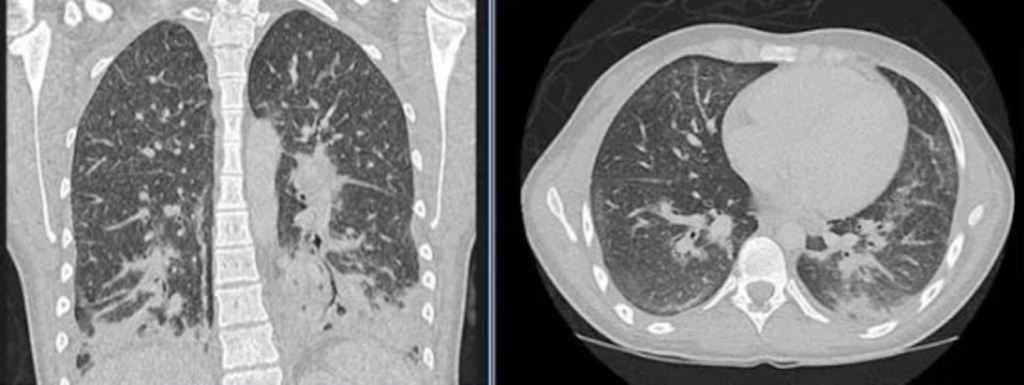 Normalmente, los pulmones sanos se ven negros en las radiografías y las tomografías computarizadas, pero en estas, gran parte se veía gris, lo cual indica que los sacos de aire de los pulmones podrían estar llenos de líquido u otras sustancias.