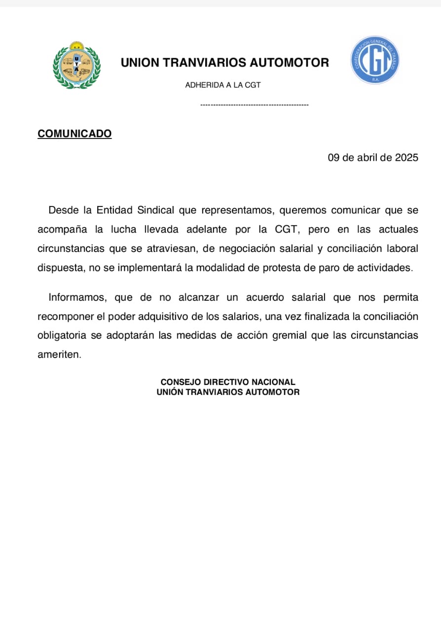 La Unión Tranviarios Automotor (UTA) anunció este miércoles que no adhiere al paro general convocado por la CGT para este jueves 10 de abril. Esta decisión se tomó en el marco de la conciliación laboral dispuesta y las actuales circunstancias que atraviesa la negociación salarial.