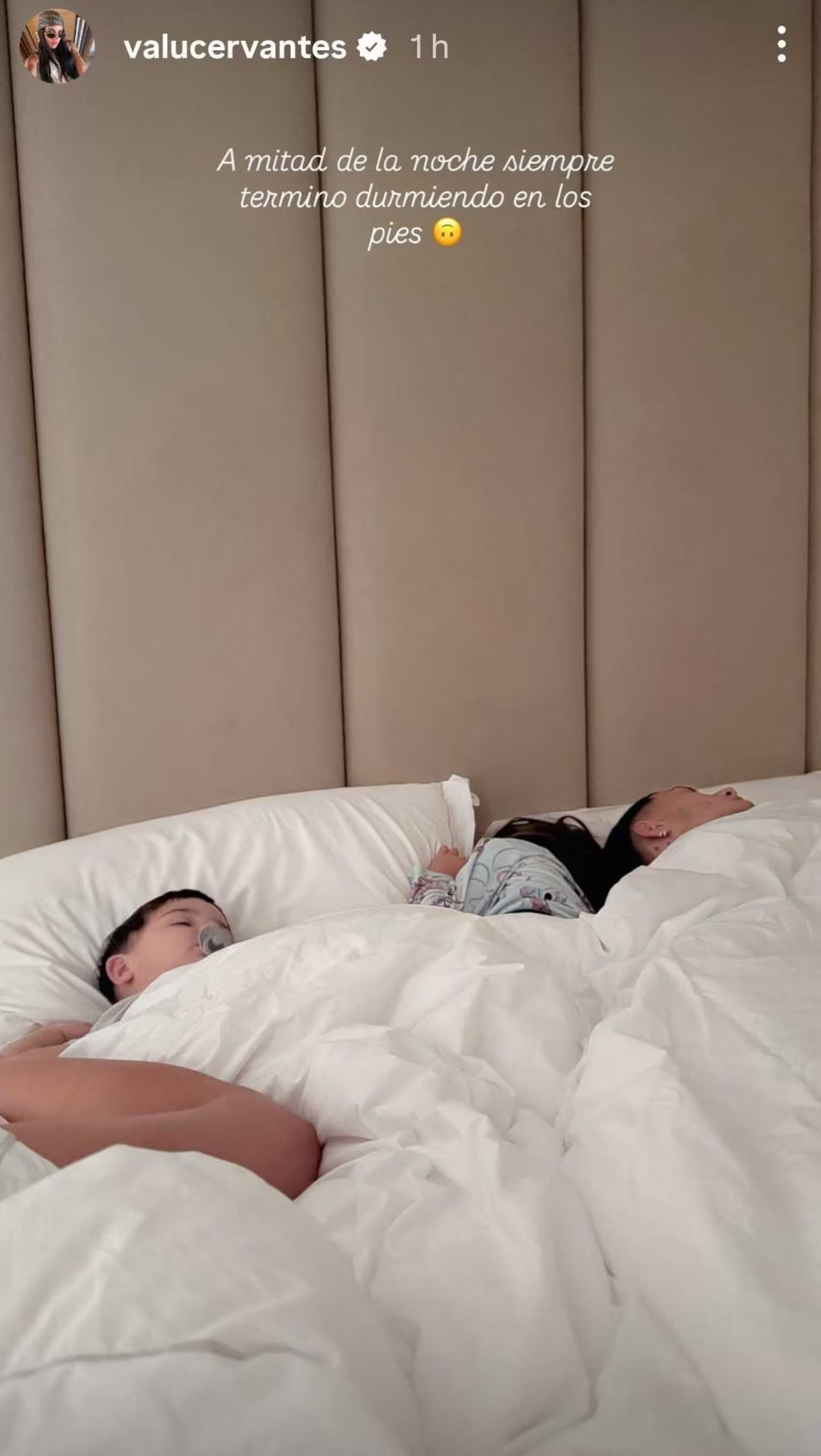La modelo publicó una foto en la que mostró que sus dos hijos, Olivia y Benjamín, la desplazaron de la cama matrimonial. A los pequeños se los vio durmiendo plácidamente en compañía de su papá y la joven ventiló cómo es su nueva dinámica para poder descansar. “A mitad de la noche siempre termino durmiendo en los pies”, sostuvo.