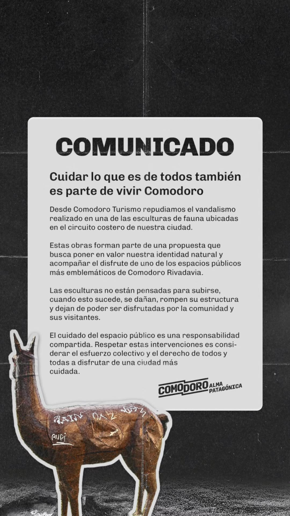 En dicho descargo repudiaron la vandalización de la escultura y recordaron que «estas obras forman parte de una propuesta que busca poner en valor nuestra identidad natural y acompañar el disfrute de uno de los espacios públicos más emblemáticos de Comodoro».