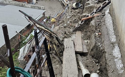 Un vez en el lugar, se comprobó que por el agua caída, un terreno cedió produciendo un desmoronamiento que terminó afectando la cañería de gas naturas que llega a varios domicilios del pasaje, ubicado sobre calle Huergo al 1.300.