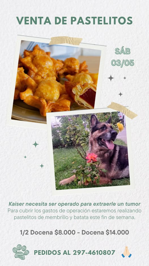 Una vecina del Barrio Pueyrredón inició una venta solidaria de pastelitos caseros para recaudar fondos destinados a la operación de su perro Kaiser, que padece un tumor de gran tamaño y necesita ser intervenido quirúrgicamente con urgencia. Los fondos también se destinarán a cubrir el tratamiento médico y los medicamentos posteriores.