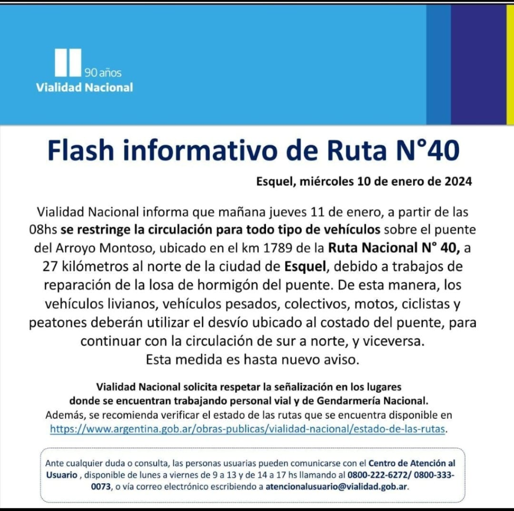 A partir del 11 de enero y desde las 08 horas de la mañana, quedará restringida la circulación de vehículos sobre el puente del Arroyo Montoso, a 27 kilómetros de la localidad de Esquel.