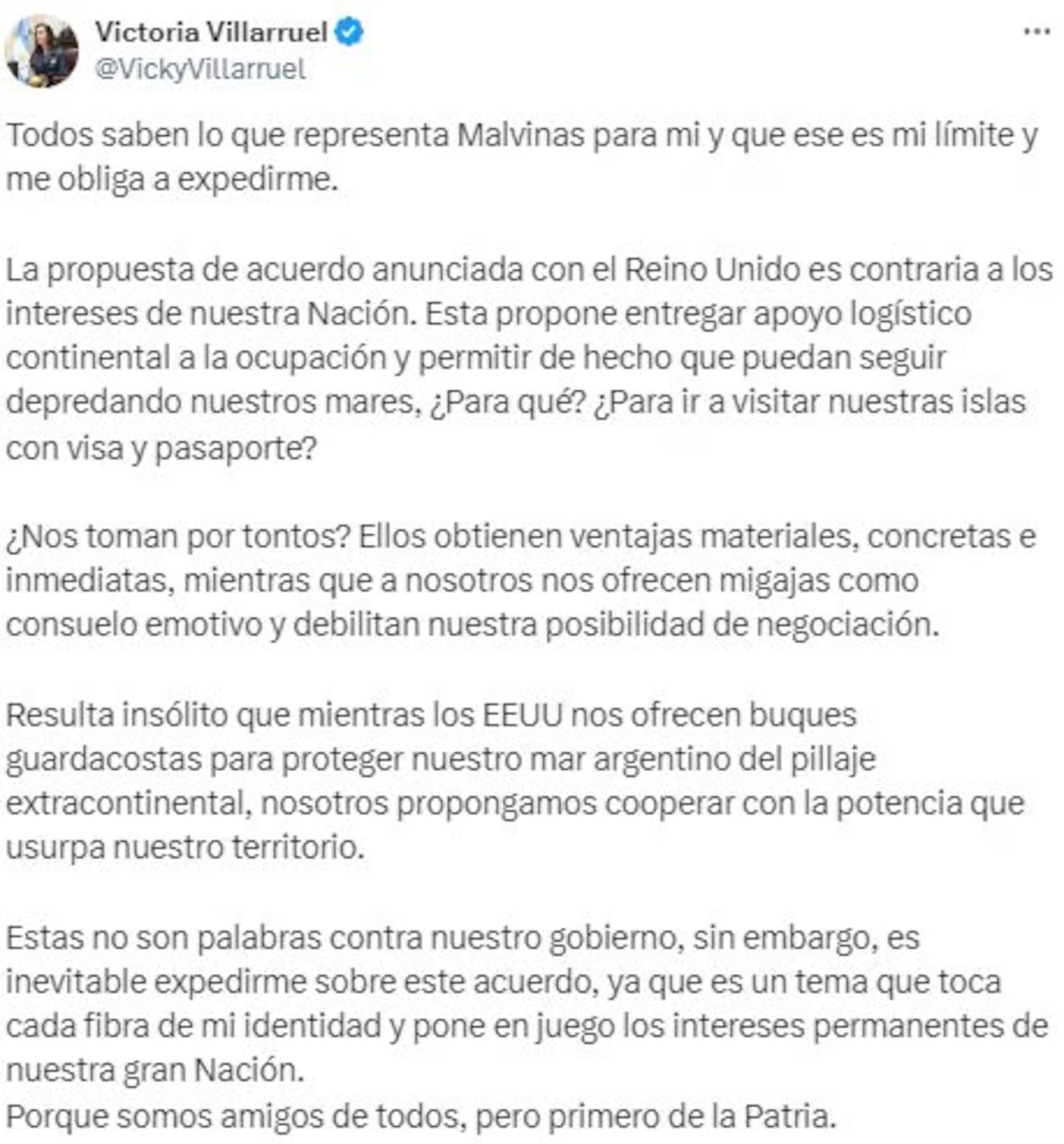 “La propuesta de acuerdo anunciada con el Reino Unido es contraria a los intereses de nuestra Nación”, afirmó Villarruel desde su cuenta de X. Y remarcó: “Esta propone entregar apoyo logístico continental a la ocupación y permitir de hecho que puedan seguir depredando nuestros mares, ¿Para qué? ¿Para ir a visitar nuestras islas con visa y pasaporte? ¿Nos toman por tontos?”.
