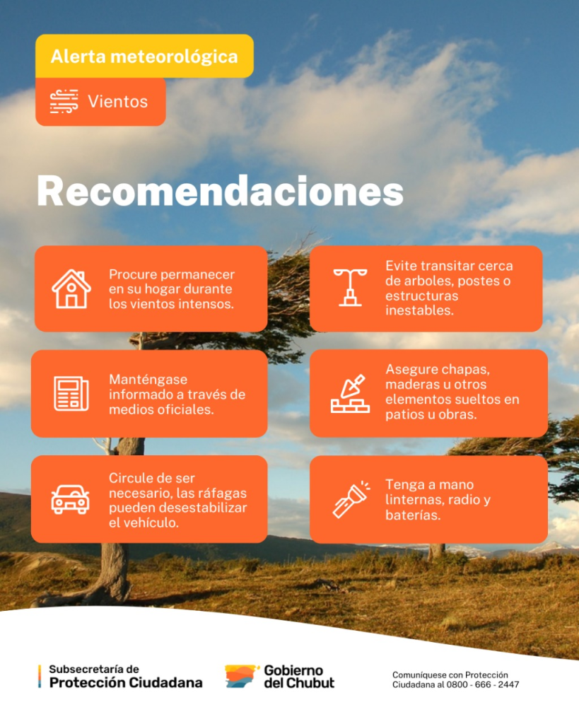 Desde la Subsecretaría de Protección Ciudadana del Gobierno del Chubut, se brindan importantes recomendaciones ante los alertas emitidos por el Servicio Meteorológico Nacional debido a vientos intensos en la región.
