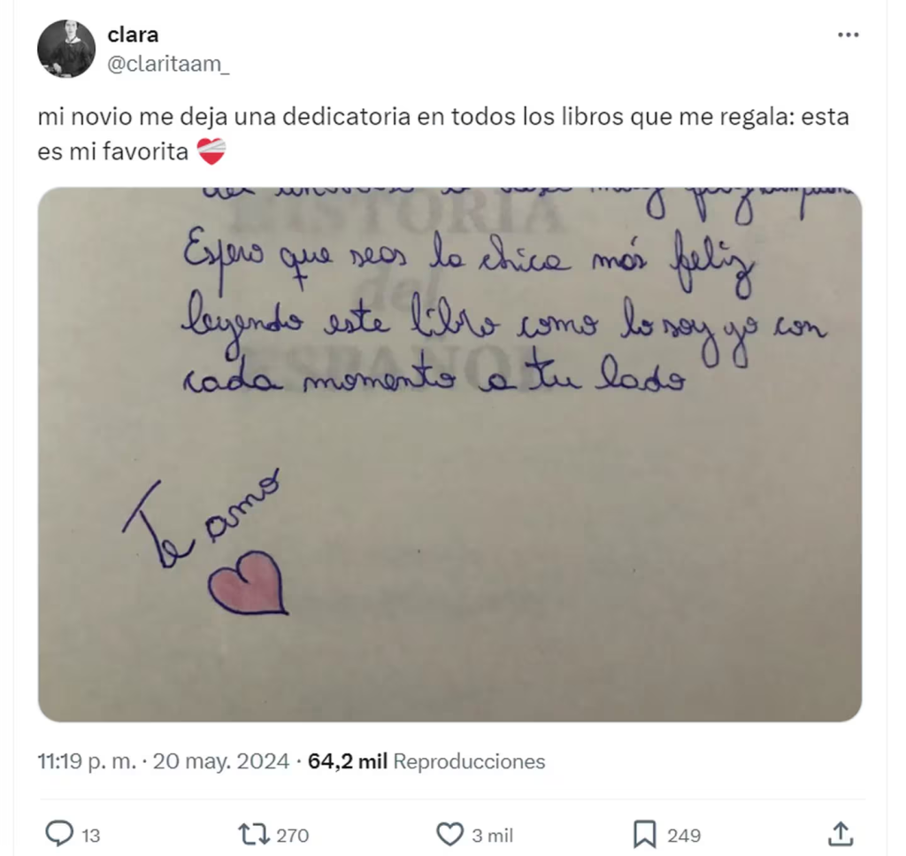 “Mi novio me deja una dedicatoria en todos los libros que me regala: esta es mi favorita”, escribió Clara a la vez que adjuntó una imagen de una parte del libro con las palabras escritas a mano.