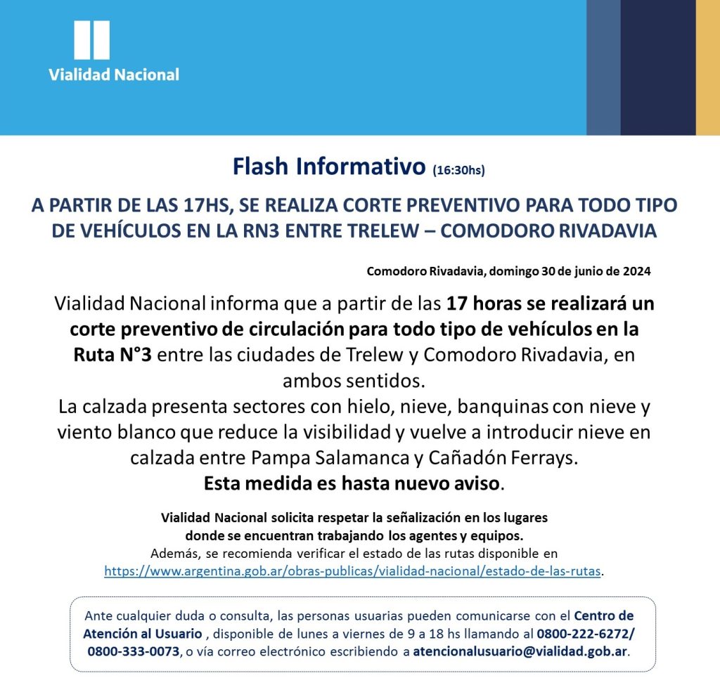 Vialidad Nacional informó este domingo que, a partir de las 17:00, se cortará la circulación en ambos sentidos en la ruta nacional Nº 3 entre Trelew y Comodoro Rivadavia.