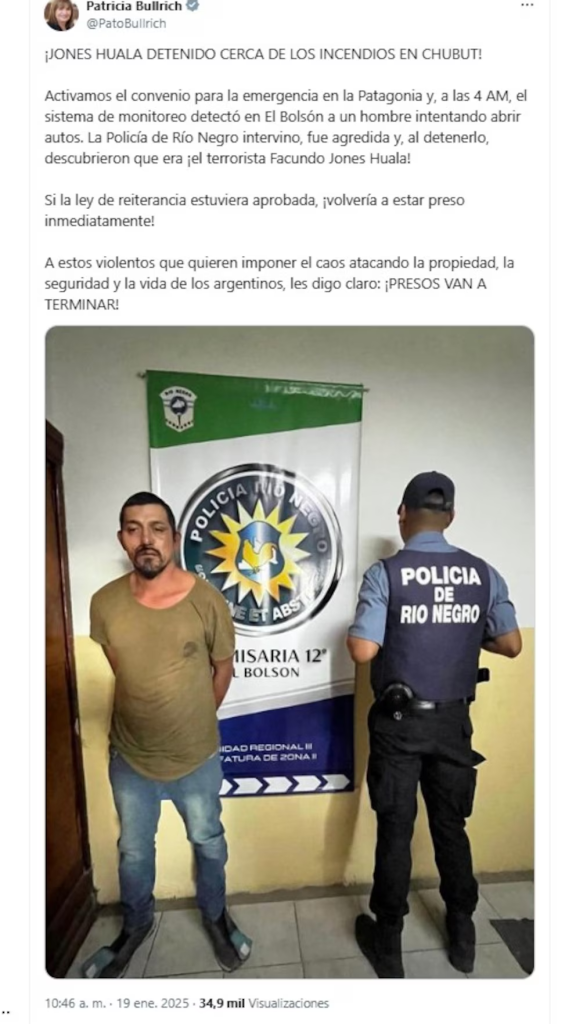 “Activamos el convenio para la emergencia en la Patagonia y, a las 4 AM, el sistema de monitoreo detectó en El Bolsón a un hombre intentando abrir autos. La Policía de Río Negro intervino, fue agredida y, al detenerlo, descubrieron que era ¡el terrorista Facundo Jones Huala!“, detalló.