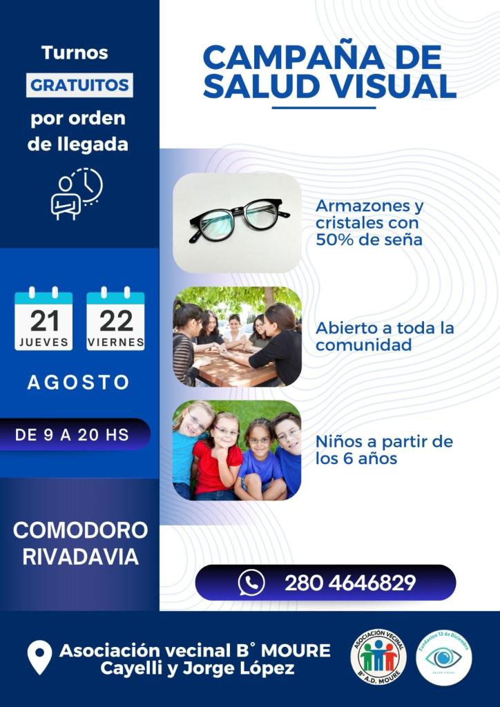 La Asociación Vecinal del Barrio Moure, ubicada en Marinero Jorge López 269, informó que mañana jueves 21 y viernes 22 de agosto estarán ofreciendo atención oftalmológica gratuita para toda la comunidad.