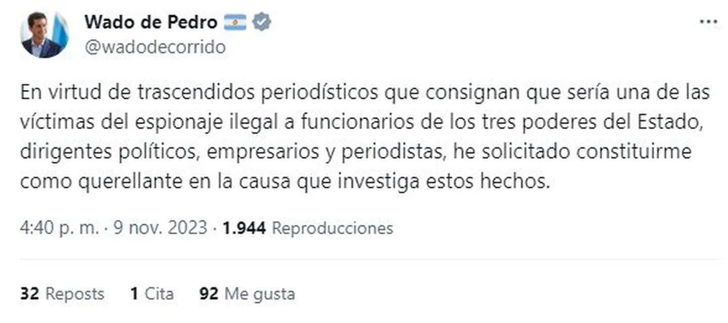 “En virtud de trascendidos periodísticos que consignan que sería una de las víctimas del espionaje ilegal a funcionarios de los tres poderes del Estado, dirigentes políticos, empresarios y periodistas, he solicitado constituirme como querellante en la causa que investiga estos hechos”, escribió el ministro del Interior.