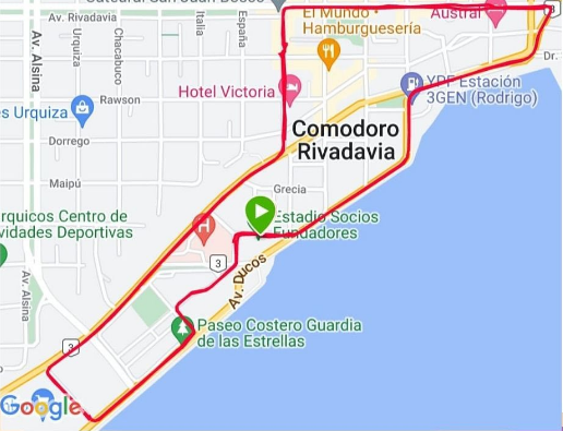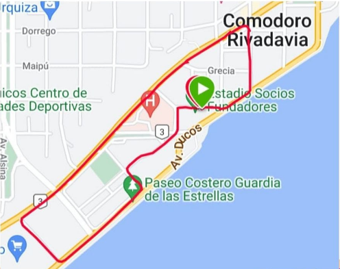 - Carrera 9 km: Roque Saenz Peña – Av. Ducos – Av. Hipólito Yrigoyen – Av. Rivadavia – Belgrano – Av. Hipólito Yrigoyen – Federico Carstens – Av. Ducos – Juan García Fernández – Bahía Bustamante – Democracia – Roque Saenz Peña.