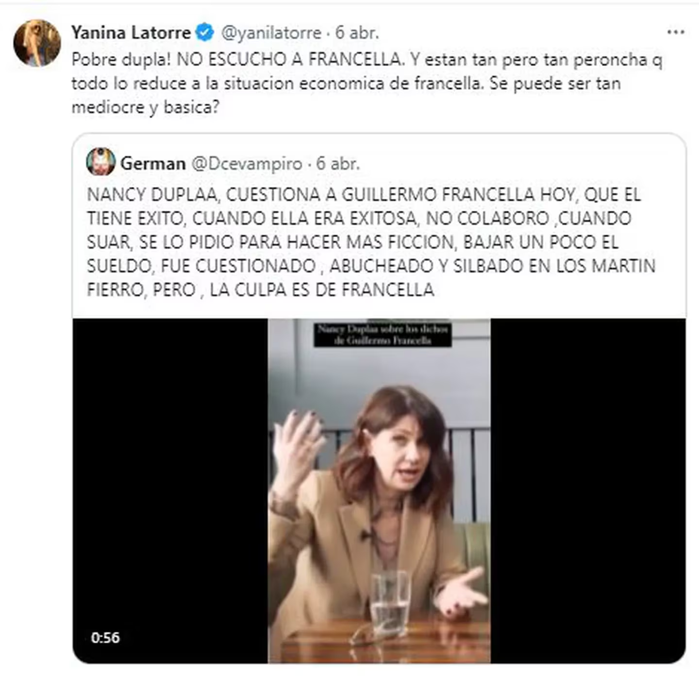 “¡Pobre Dupláa! No escuchó a Francella. Es tan, pero tan peroncha, que todo lo reduce a la situación económica de Francella. ¿Se puede ser tan mediocre y básica?”, se preguntó, filosa como es su costumbre.