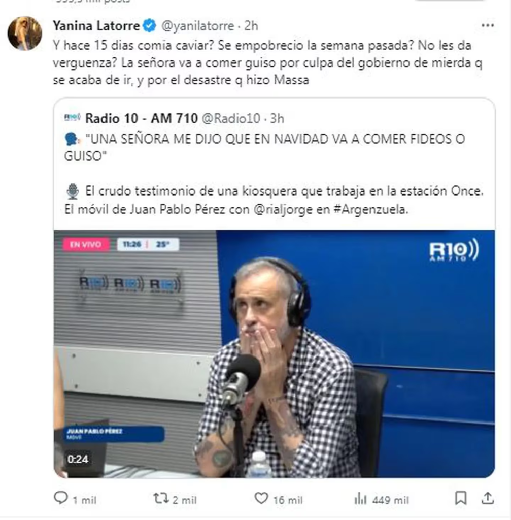 Latorre se hizo eco del fragmento de la noticia y salió al cruce en sus redes sociales. “¿Y hace 15 días comía caviar? ¿Se empobreció la semana pasada? ¿No les da vergüenza? La señora va a comer guiso por culpa del gobierno de mierda que se acaba de ir, y por el desastre que hizo Massa”, sostuvo con firmeza.