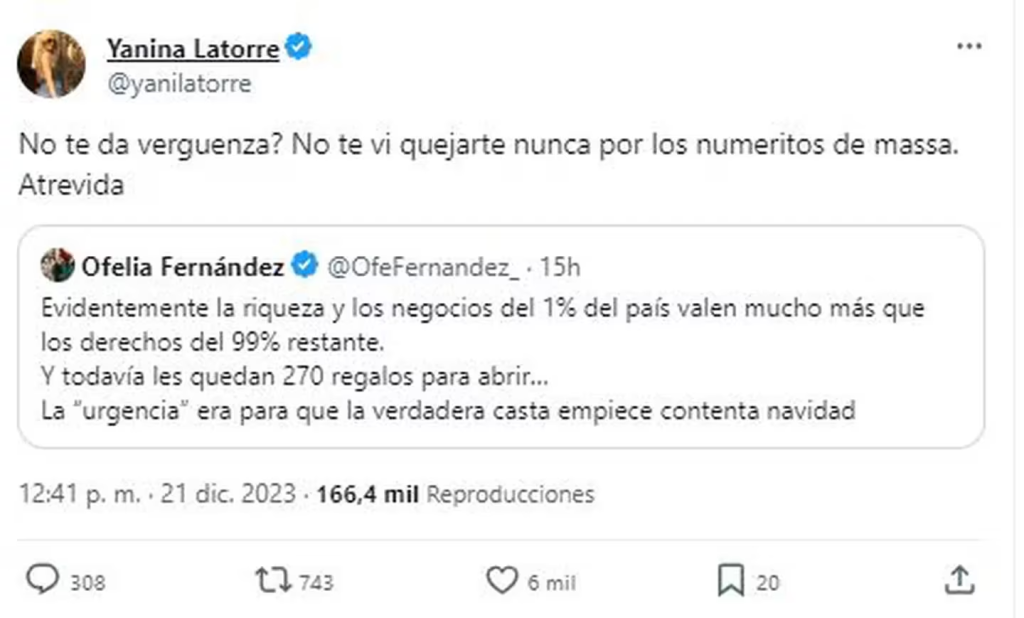 “Evidentemente, la riqueza y los negocios del 1% del país valen mucho más que los derechos del 99% restante. Y todavía les quedan 270 regalos para abrir… La ‘urgencia’ era para que la verdadera casta empiece contenta Navidad”, escribió la exlegisladora de la Ciudad de Buenos Aires. Furiosa, Yanina retrucó: “¿No te da vergüenza? No te vi quejarte nunca por los numeritos de Massa. Atrevida”.